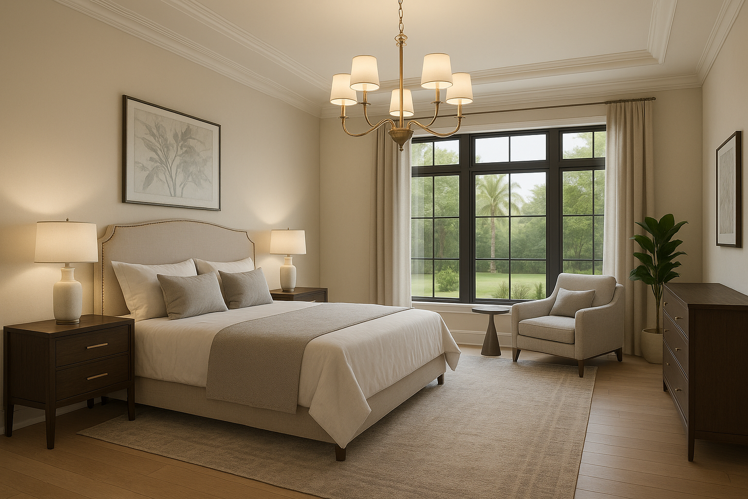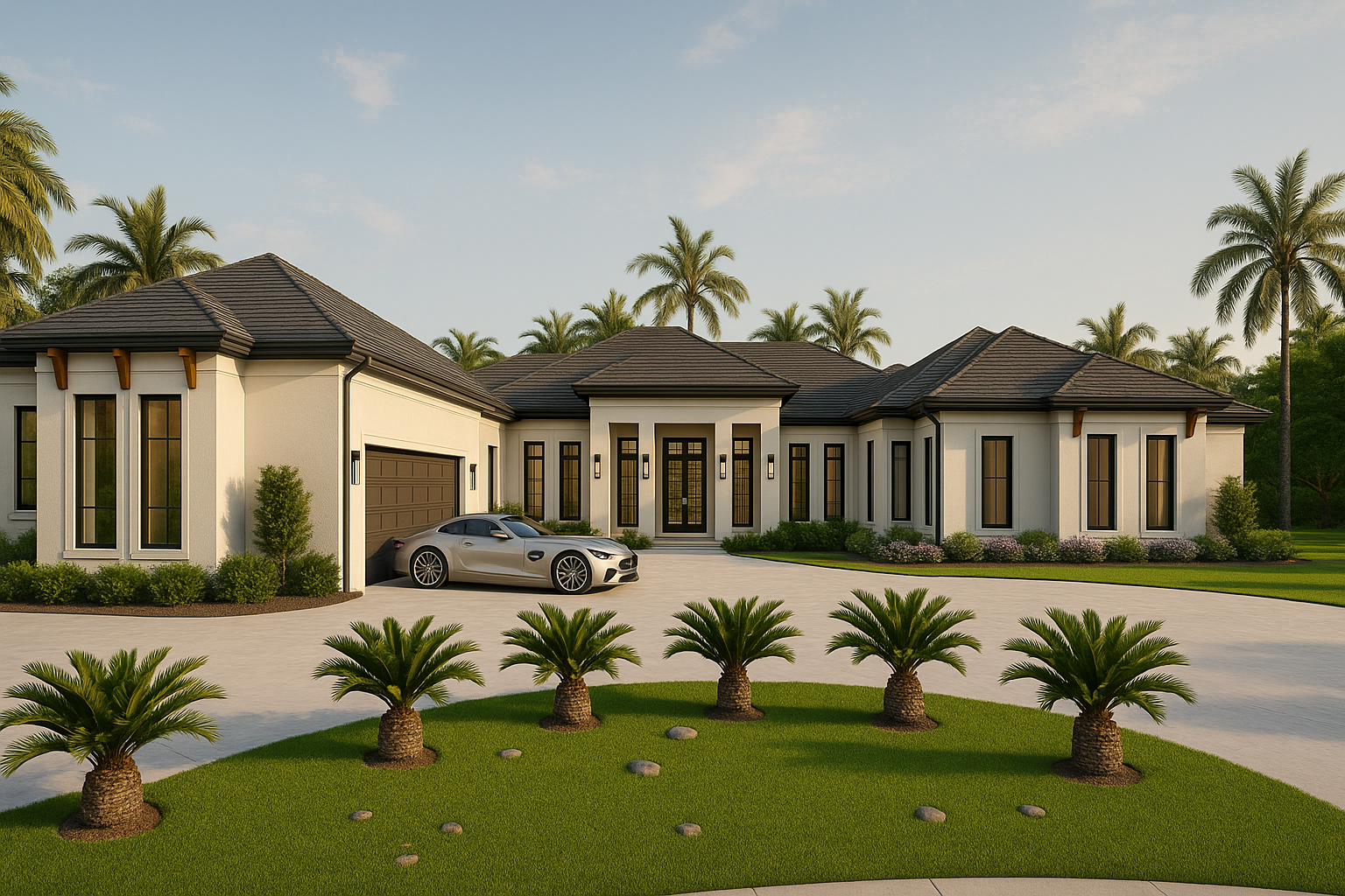 Luxury modern house with a driveway, sports car parked outside, and palm trees in the yard and surrounding landscape.