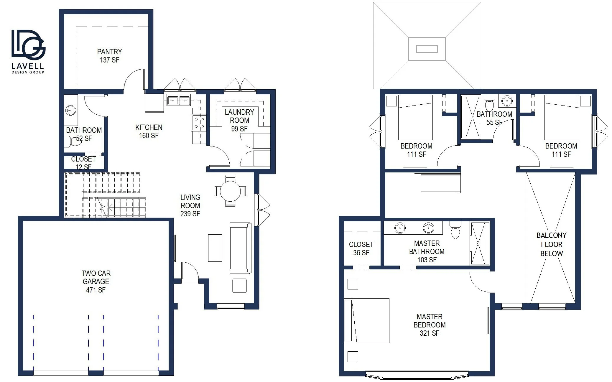 Floor plan of a two-story house showing various rooms, including a two-car garage, living room, kitchen, pantry, laundry room, and bathroom on the first floor, and bedrooms, bathrooms, closets, and a balcony on the second floor.