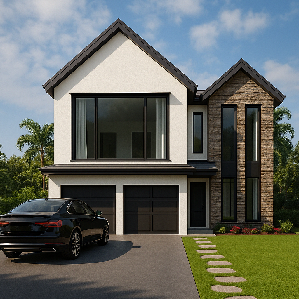 Modern two-story house with black garage doors, large windows, a manicured lawn, and a black car parked outside.