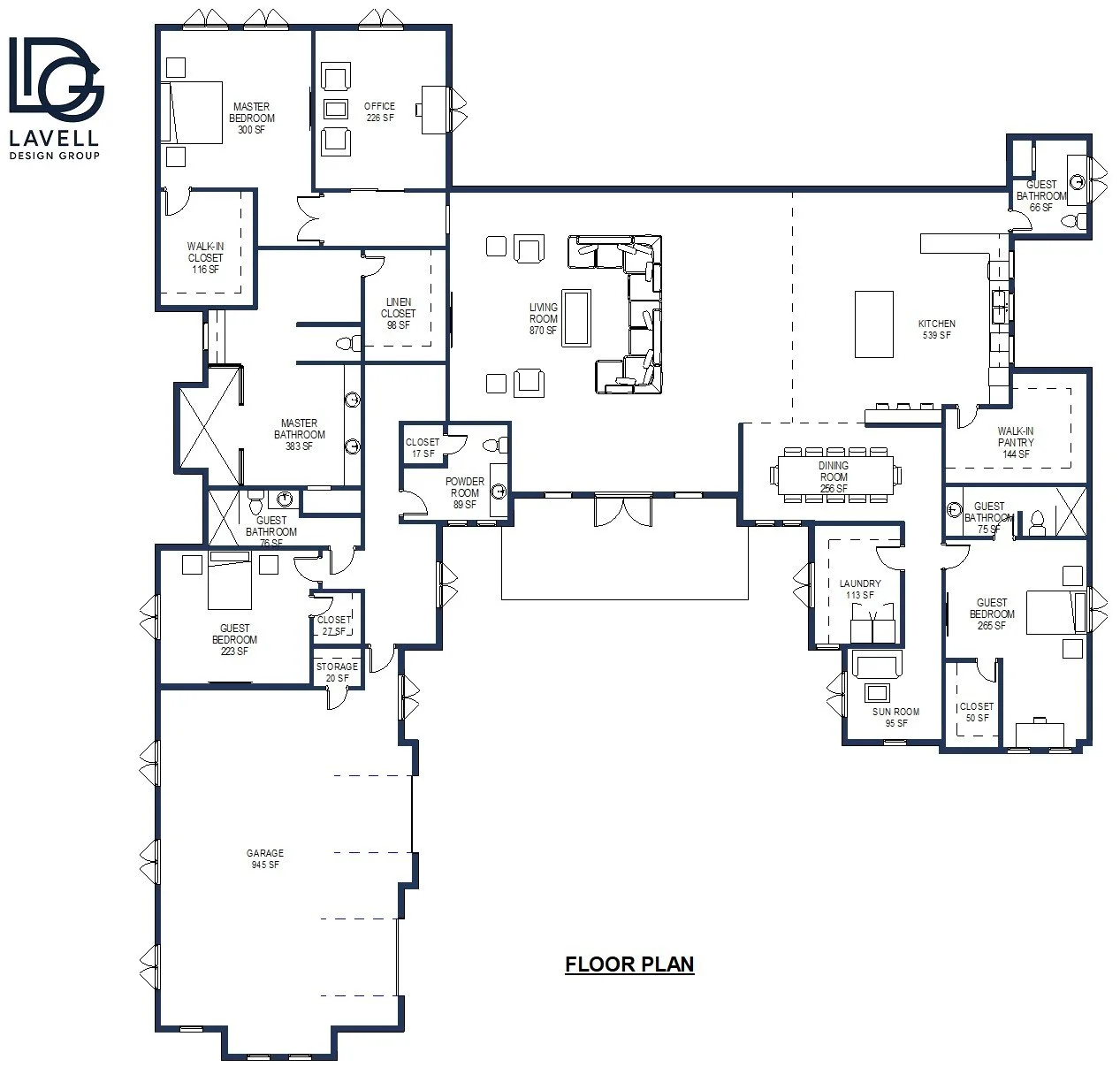 Detailed floor plan of a house showing various rooms including bedrooms, bathrooms, living room, kitchen, dining, laundry, sunroom, storage, garage, and a few closets.