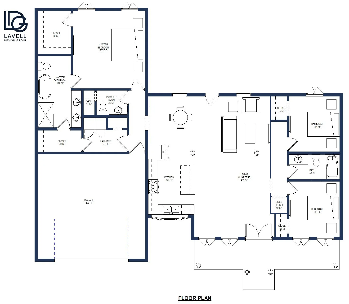 Floor plan of a house with two bedrooms, two bathrooms, a living room, kitchen, laundry room, powder room, closets, and an attached garage.